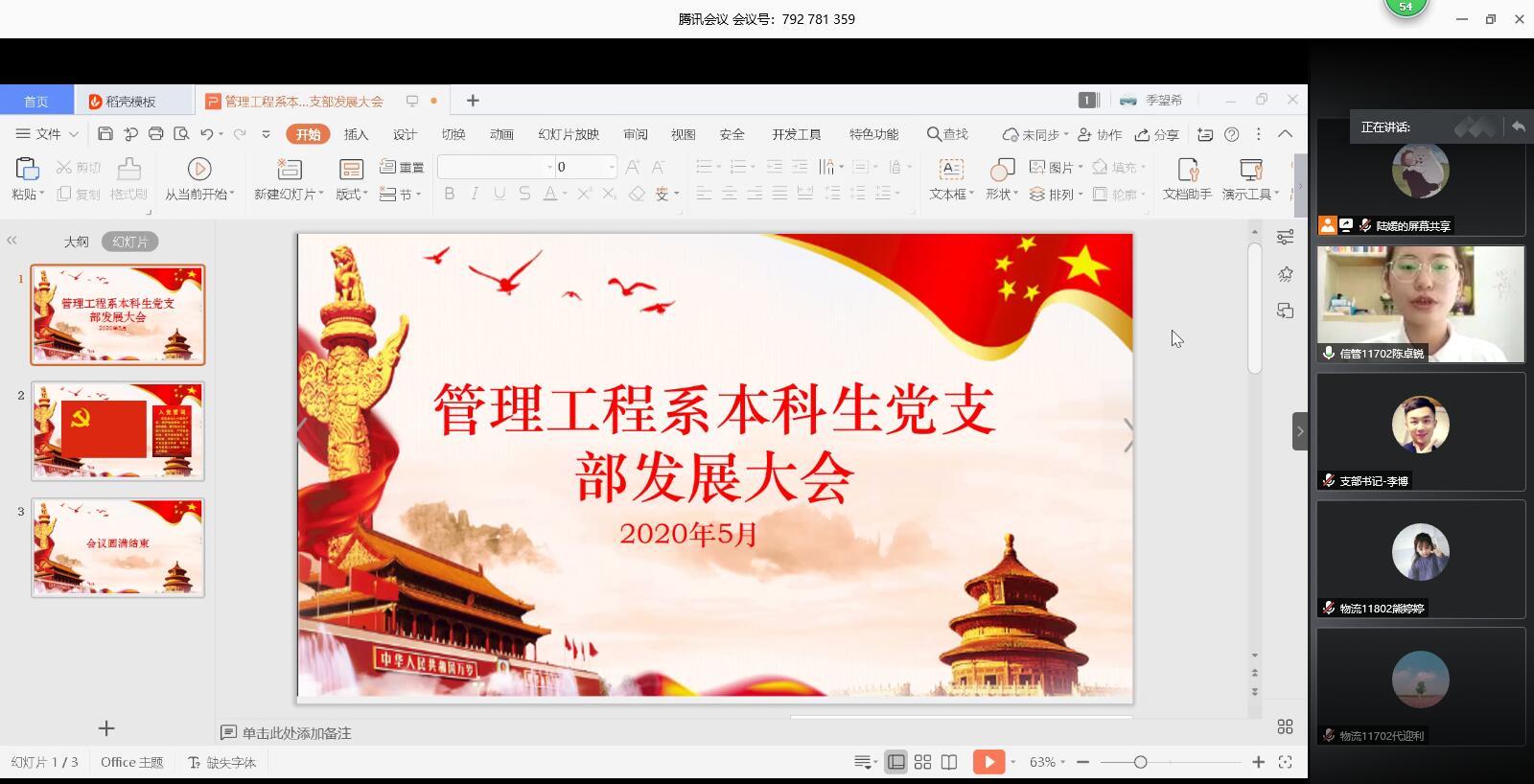 2020年5月25日下午2点,威廉希尔中文网站管理工程系本科生党支部在腾讯会议上召开了党员发展大会。会议主要目的是讨论关于发展陈卓锐等6名同志为预备党员的事宜,本次会议由陆媛主持,参加人员主要有管理工程党支部书记李博老师、8位正式党员、14位预备党员以及6位发展对象。