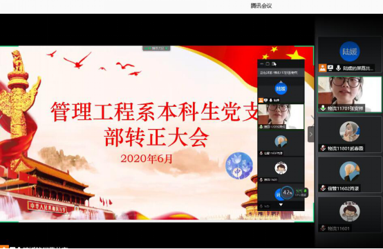 2020年6月5日下午两点,威廉希尔中文网站管理工程系本科生党支部在线通过腾讯会议召开了预备党员转正大会。参与此次会议的有管理工程系本科生党支部书记李博、员工党员与预备党员,会议由陆媛主持。