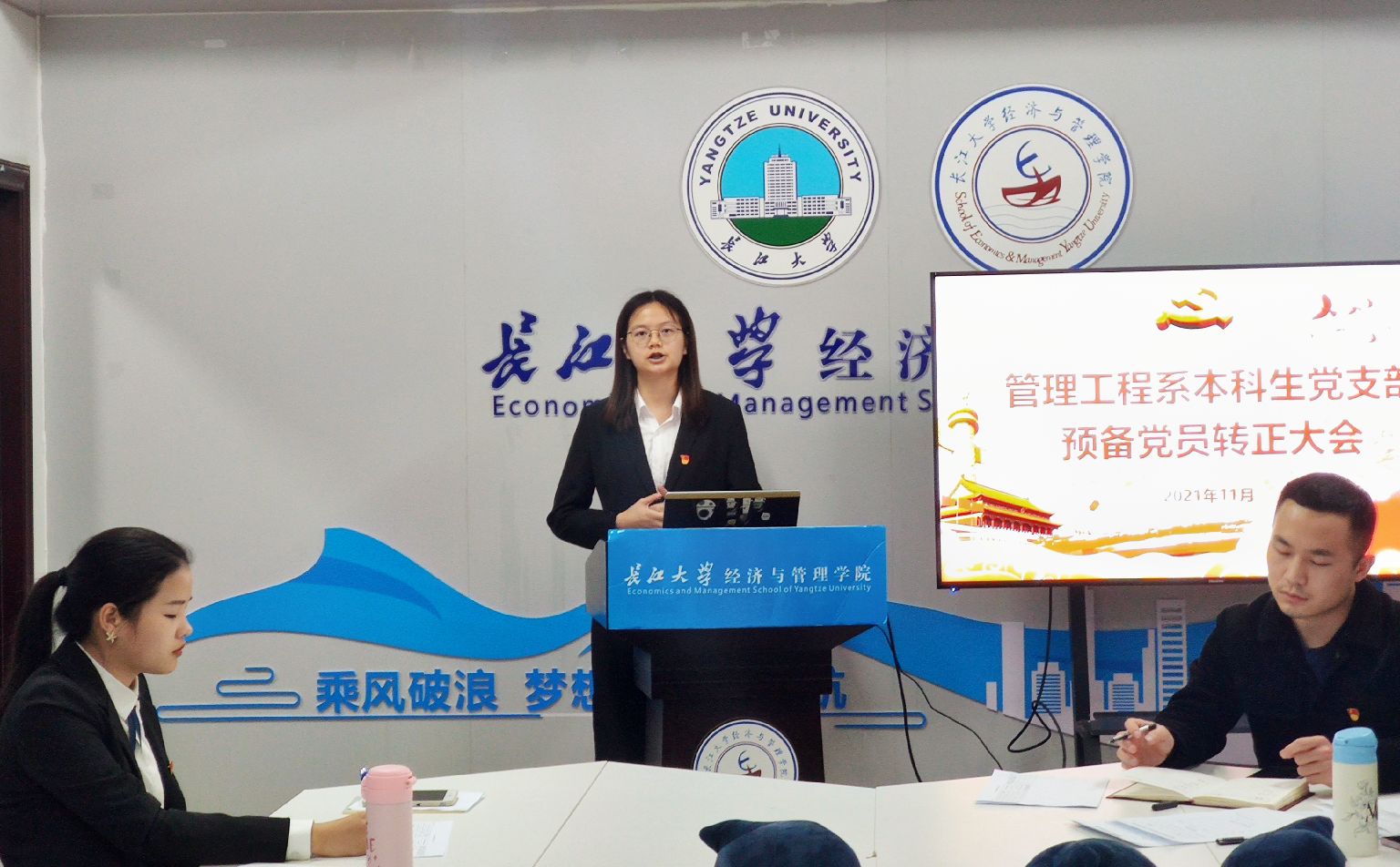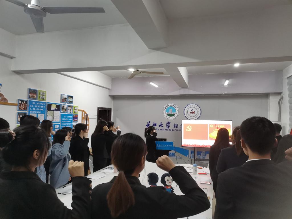 会议伊始,由主持人张华介绍会议流程,组织委员强调大会纪律。会上,罗靖宝等4位预备党员相继汇报自己在预备期间中的表现,总结了在思想上、工作上、学习上以及生活上的进步和不足,最后表达了自己对加入中国共产党的坚定决心和信念。汇报完毕后,正式党员进行不记名投票,主持人张华宣读决议,罗靖宝等4位预备党员全票通过成为中共党员。在张华同志的带领下,全体党员在庄严的党旗下宣读入党誓词。