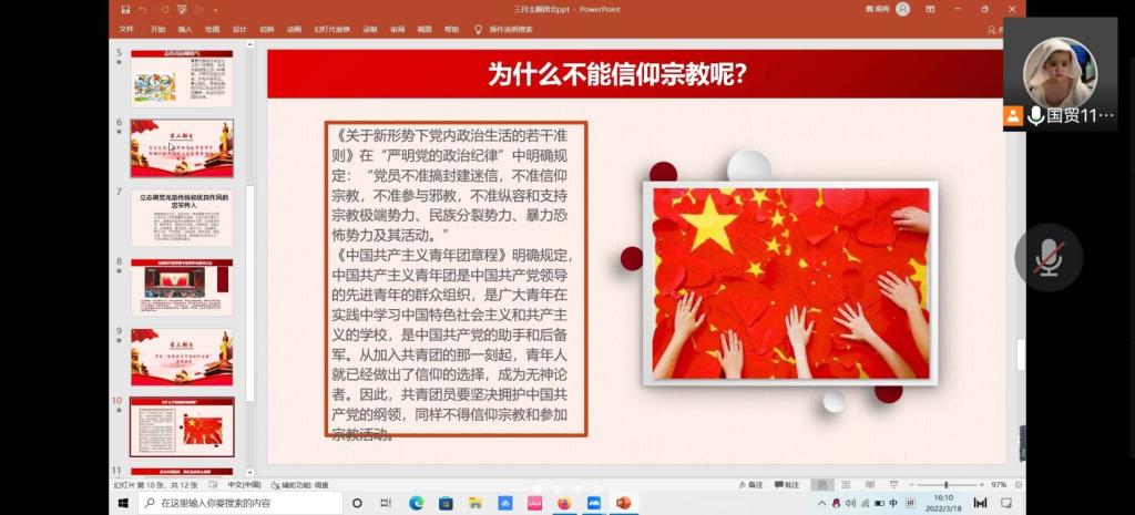 最后,主持人采取了新闻报刊与趣味问答相结合的的方式,引导同学们认真学习本次团会,指引共青团员成为一名坚定的马克思主义无神论者。