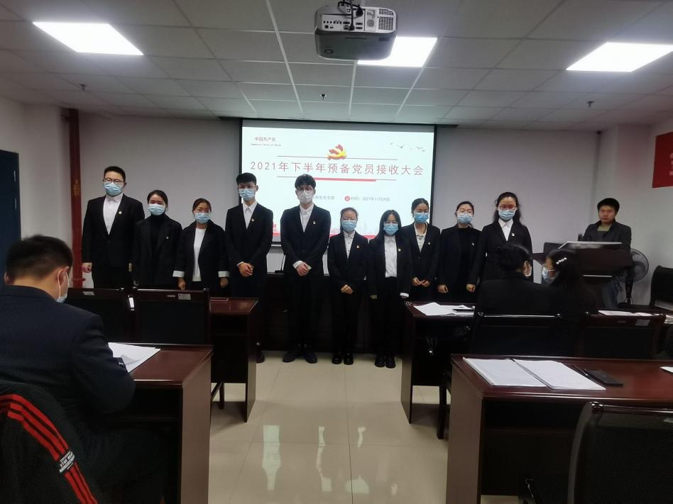 会议伊始,由主持人黄承石老师介绍会议流程,强调大会注意事项。随后,以陈可玥同志为代表的20名发展对象汇报自己的思想工作表现情况。在表述过程中,发展对象们都表达了自己在发展阶段中的个人表现,总结自己的优缺点,表明自身态度和决心。经过8位正式党员的不记名投票后,最终确定陈可玥等20名同志发展为预备党员。在党支部副书记贾溢同志的带领下,全体党员在庄严的党旗下宣读入党誓词。