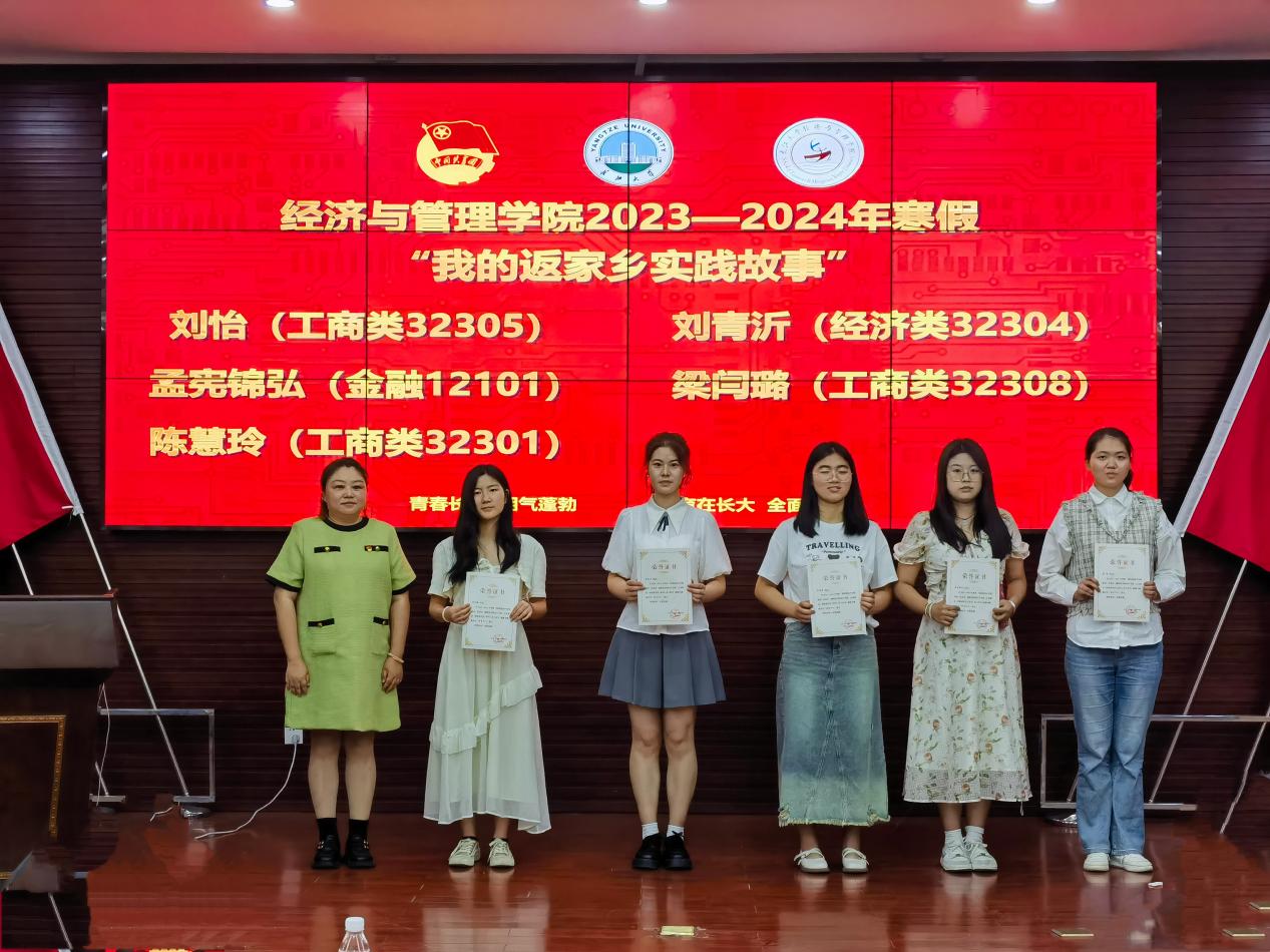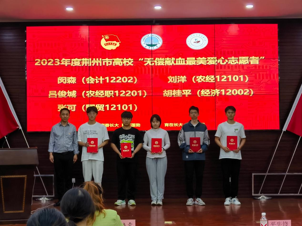 主持人王璐佳宣读学院志愿服务表彰文件,会计12202班闵森、农经职12201班吕俊城、国贸12101班张可、农经12101班刘洋和经济12002胡桂平5名同学获2023年度荆州市高校“无偿献血最美爱心志愿者”,工商类32305班刘怡、金融12101班孟宪锦弘、工商类32301班陈慧玲、经济类32304班刘青沂和工商类32308班梁闫璐5名同学获英国威廉希尔公司2023—2024年寒假“我的返家乡实践故事”优秀个人,大家先后上台接受表彰。