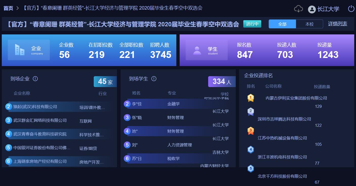 (通讯员 苏帅)“春意阑珊,群英经管。”为了高效服务毕业生开展求职,加强与用人单位开展招聘工作,经济与管理公司于4月27--28日举办2020届春季空中双选会。本次双选会参会单位56家,共提供职位数219个,设置招聘人数达3745人,涉及单位以武汉为主,还包括来自北京、广东、上海、湖南等多个省/市,提供包含金融业务员、经济业务员、储备经理以及辅导老师等多种岗位。参与本次空中双选会的员工共报名847人,共计投递简历1243人次。