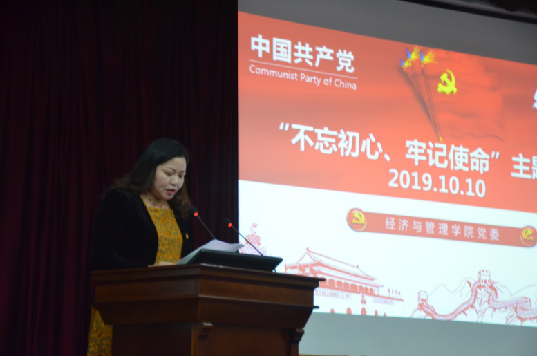 随后党委副书记王中梅对全体教职工开展“不忘初心、牢记使命”主题教育报告。她指出全体党员要自觉地做到坚定政治信仰,相信党拥护党;要净化政治生态,保持初心。此外,她还希望全体教职员工能做到不忘初心、牢记使命,聚焦学院的任务目标,确保学院的建设,让学院发展得更好。