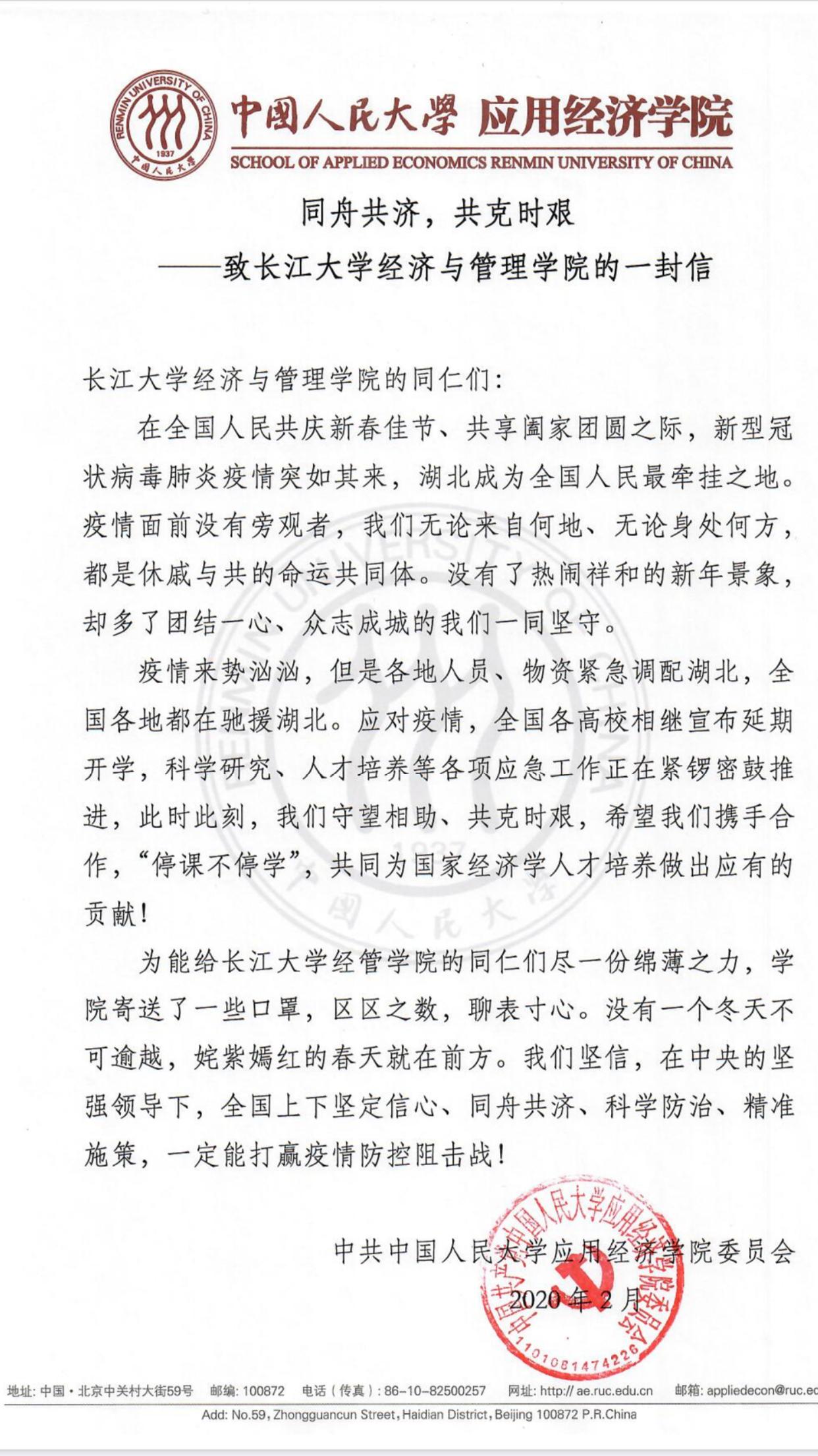 目前,我们全院师生一方面在紧锣密鼓抗击疫情,另一方面正积极响应教育部“停课不停学”号召,科学有序地组织开展线上教学、科学研究等工作。在这个特殊时期,中国人民大学应用经济学院主动伸手驰援我们,我们铭记在心。疫情无情,人间有爱,就让我们一起守望相助,共克时艰,同时也希望公司教职工以此为契机,多向中国人民大学应用经济学院学习,采取“大手牵小手”的方式,在人才培养、团队建设等方面有更大的收获。