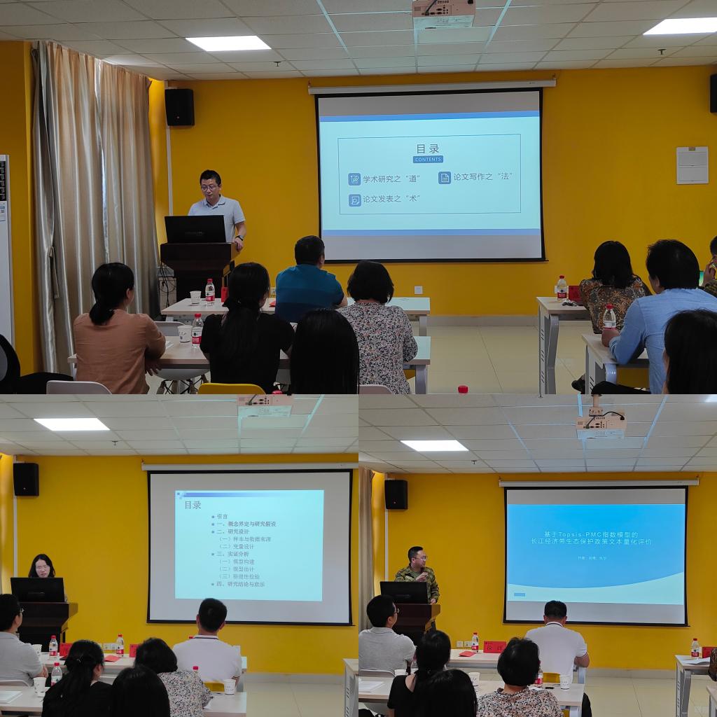 报告会第三阶段,肖博博士就目前正在投稿的论文“基于Topsis-PMC指数模型的长江经济带生态保护政策量化评价”展开分享。论文对2016—2021年间国家颁布的8项长江经济带生态保护政策进行了文本挖掘和Topsis-PMC指数模型的量化评价,结合PMC指数和PMC曲面图对政策进行了深入分析,通过实施的实际情况对政策进行宏微观评价,为政府的政策制定献言献策。肖博士的论文报告很好的将理论与实际结合起来,不仅让参会人员体会到肖博士对于科研的热情和执着,更加深了我们对“做有现实意义学术研究”的体会。