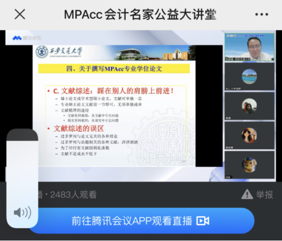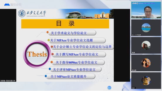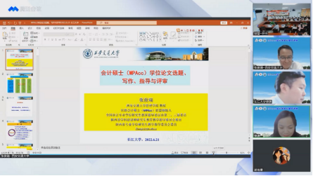 张教授则首先感谢了中国会计学会、全国会计专业学位研究生教育指导委员会和williamhill官网提供的这次交流机会,并祝贺公司会计学成为国家级一流本科专业建设点;随后,他从学术论文与学位论文的区别谈起,给出了MPAcc学位论文研究类型的选择建议,重点对MPAcc学位论文的选题、定位与边界进行了阐述,指出MPAcc学位论文应紧密结合会计实务;接着,张教授围绕MPAcc学位论文的撰写、指导与评审三个方面分别结合实际案例列举了许多共性问题,并为解决以上问题、提升MPAcc学位论文质量提供了一系列建议;最后,师生们与张教授就MPAcc学位论文写作的相关问题进行了积极的线上交流与互动。
