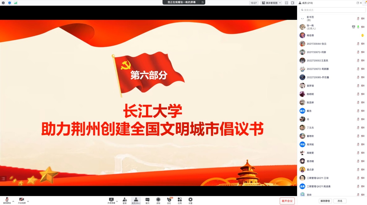会议最后向大家宣读了《williamhill官网助力荆州创建全国文明城市倡议书》,《倡议书》指出:2023年是荆州市争创第七届全国文明城市的冲刺之年、大考之年、决胜之年,作为荆州市民,我们每一位同学都要立马行动起来,争做文明理念的倡导者、争做文明礼仪的传播者、争做文明行为的践行者、争做文明创建的参与者、争做文明形象的维护者,为创建全国文明城市助力添彩。