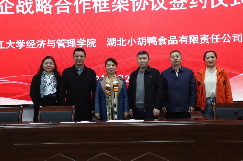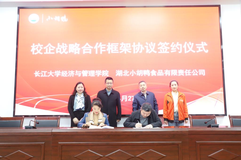 (通讯员 黄胜胜 彭文桦)2023年4月27日,威廉希尔中文网站与湖北小胡鸭食品有限责任公司校企战略合作框架协议签约仪式在学校15教学术报告厅举行。小胡鸭董事长胡秀容,董事长助理陈思才,党支部书记陈海燕,宣传部长姚瑜出席签约式,学院经理徐辉,副经理陈承,副书记王中梅及学院25名教师代表,200名员工代表参加签约仪式及励志报告会。