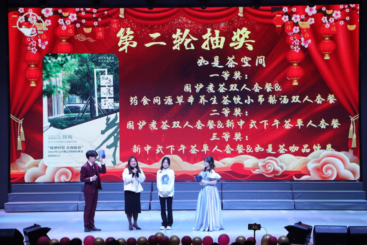 晚会现场,一段古典舞《如梦令》带领观众“误入藕花深处”、歌曲《美丽的神话》让人与人之间的相遇迸发出令人美慕的火花、器乐合奏《凤凰于飞》琴瑟和鸣绵延不绝……由学工战线的辅导员们带来的歌曲《再度重相逢》将现场气氛再次点燃,掌声、叫好声震耳欲聋;相声《我要发财》紧扣老员工生活实际,展现了新时代青年随迷茫无助,但仍昂扬向上积极进取的精神风貌;魔术《美女拼图》一出场便引来阵阵喝彩,凝眸处云遮雾绕,说话间斗转星移;歌曲合唱《一起向未来》讲出了经管青年与祖国同向,与时代时代同行的心声。多样的艺术形式、精彩的节目内容,让全体师生共同沉浸在这场歌舞的盛宴之中。荆州市创学职业学校、未来+SaLon、如是茶空间、第二人生剧本杀等多个企业和商家对本场晚会进行了支持与赞助,丰富的伴手礼和多轮抽奖让同学们热情高涨。