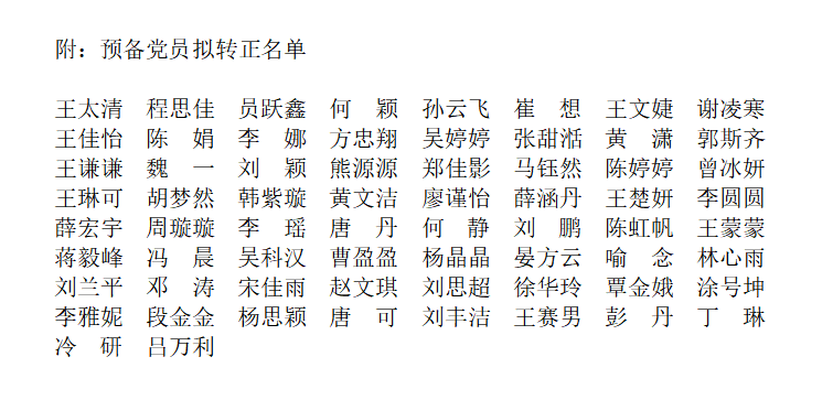 经过党支部对预备党员1年的培养教育和考察,经支部委员会会研究确定,报分党委审查同意,将于近期召开党员大会讨论王太清等66名同志预备党员转正,特在全院范围内进行公示。