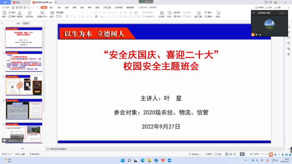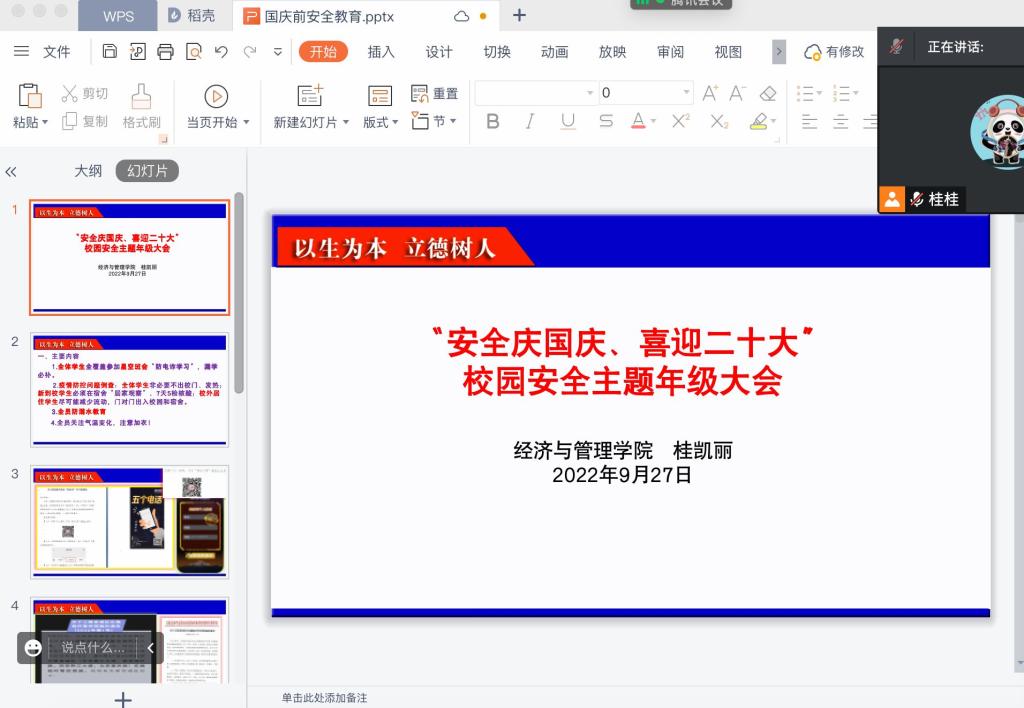 (通讯员:金小晶)为切实增强员工的安全防范意识,保障员工安全,踔厉奋发迎接党的二十大胜利召开,英国威廉希尔公司全体员工于2022年9月27日开展了“安全庆国庆、喜迎二十大”的校园安全主题班会。