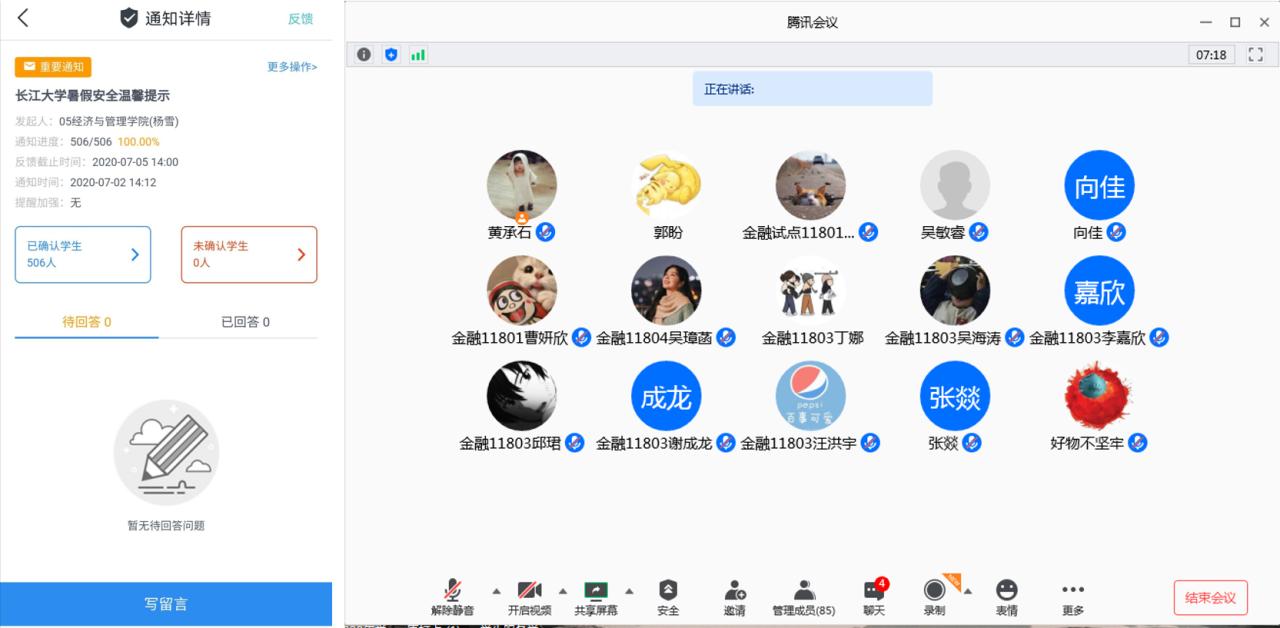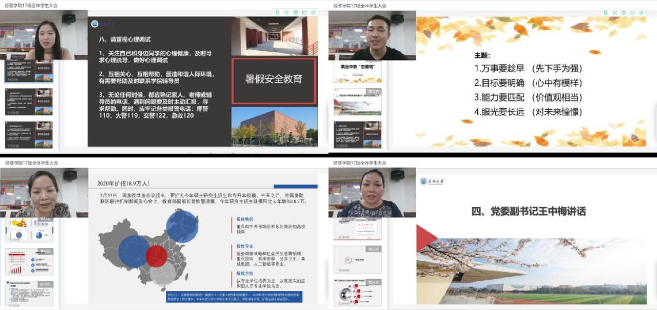 7月7日上午10点,英国威廉希尔公司2017级全体员工大会通过视频会议形式召开。会议以“安全·就业·考研”为主题,学院2017级940余名员工在云端参加了会议。会议上,2017级年级辅导员杨雪向全体员工传达了暑假期间学校的相关管理规定,并再次强调暑假安全注意事项。就业专干李博以“恋爱关系”类比就业工作,向员工传达“趁早、明确、匹配、长远”的就业观。副经理裴潇,围绕学院研究生教育概况、招生政策及推免政策三个方面,详尽讲解了研究生相关工作。会议最后,党委副书记王中梅向2017级全体同学表达了谆谆告诫和殷殷期盼之情,强调应关注学分,确保人人顺利毕业;注意假期安全,平安迎接开学;做好未来规划,迎接美丽人生。