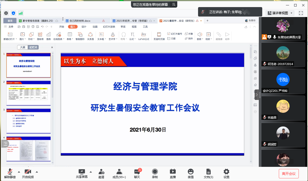 会上,朱翠玲老师着重从暑假安全责任书、研究生外宿审批、暑假留校审批以及暑假安全总体要求等四个方面做出暑期安全工作部署,为大家暑期离校等安排规划提出明确要求。