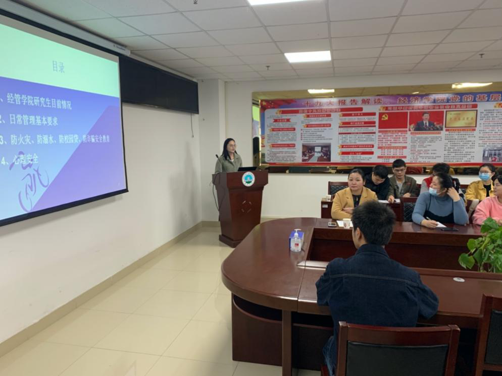 首先,辅导员朱翠玲讲解了校纪校规,梳理了研究生日常管理工作思路,要求同学们要提高防火灾、防溺水、防校园贷、防诈骗、防艾等安全意识,加强关注自身和同学心理安全。作为员工骨干,要做到“及时发现、及时上报”。